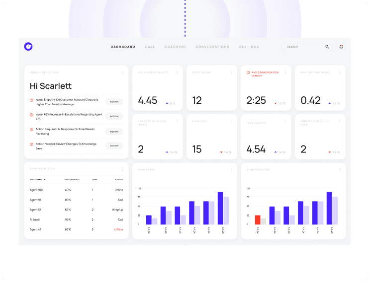 Instead of sampling 2% of interactions, Magpie tracks every conversation. Access real-time insights on agent performance, emerging product issues, and shifting customer needs through a unified dashboard. Make informed decisions based on complete data, not guesswork.